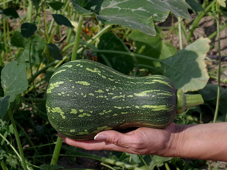 Среднеспелый порционный гибрид мускатной тыквы. От всходов до начала плодоношения проходит около 100 дней. Растение длинноплетистое. Плоды грушевидной формы, с тонкой, но твердой корой темно-зеленого цвета с контрастным крапом, массой около 1,5 кг. Мякоть сладкая, плотная, сочная, желто-оранжевого цвета, с высоким содержанием сахаров и сухого вещества, семенная камера очень маленькая. Гибрид устойчив к основному комплексу болезней. Плотность посадки — 1 растение/1,5 м2. Для гибрида характерна высокая урожайность: с одного растения можно собрать более 10 плодов общей массой до 22,0 кг.