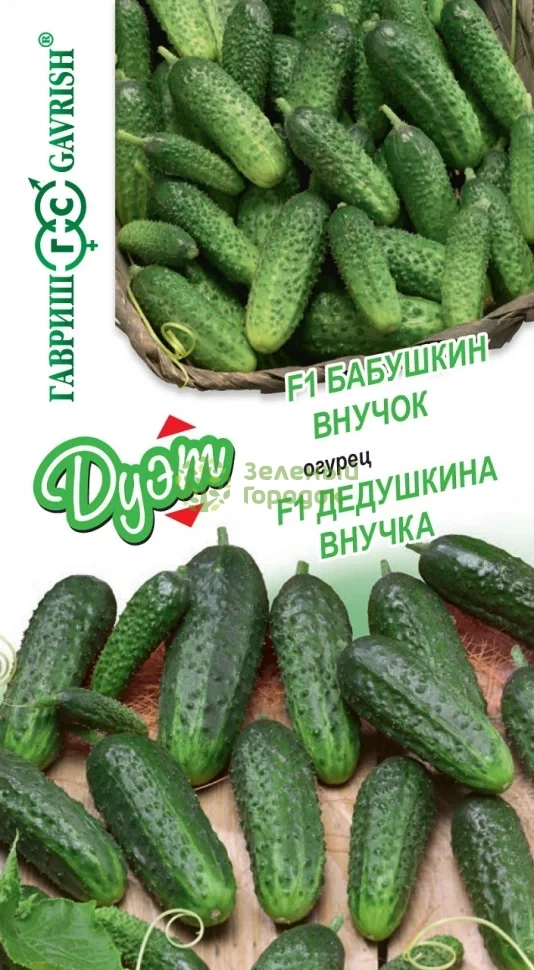 Огурец Дедушкина внучка: Скороспелый (40-45 дней) партенокарпический гибрид с букетным заложением завязей (по 2-3 в узле). Зеленец цилиндрической формы, темно-зеленый, длиной 12-14 см, массой 130-150 г. Поверхность плода бугорчатая, бугорки среднего размера, расположены часто, опушение белое. Использование плодов универсальное (в свежем виде, засолка, маринование). Гибрид устойчив к настоящей мучнистой росе, оливковой пятнистости, толерантен к ложной мучнистой росе и корневым гнилям. Выращивают в открытом грунте и пленочных теплицах рассадным способом или прямым посевом в открытый грунт.