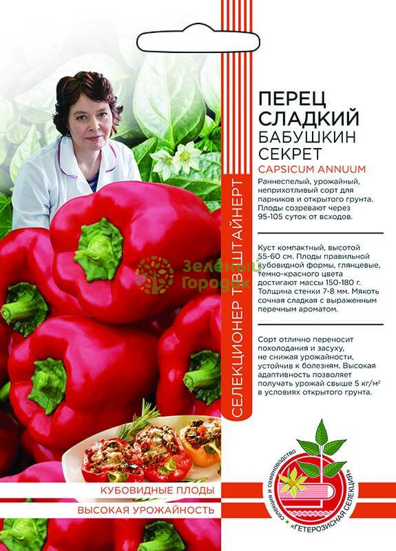 Сорт неприхотливый и простой в уходе, создан специально для регионов с прохладным климатом. Яркие, с глянцевой поверхностью плоды восхитительно смотрятся среди зелени куста, поднимая настроение своей изысканной красотой. Уже через 95-105 дней после появления всходов можно насладиться первым урожаем. Одновременно на одном растении растет до 14 увесистых плодов средней массой 165 г, а отдельные экземпляры могут достигать 230 г. Сочная хрустящая мякоть с толстыми стенками очень сладкая, имеет насыщенный аромат перца. А цитрусовые нотки во вкусе придают особую магию, цепляющую струны души. Вот такой он, «Бабушкин секрет», пришедший к нам из глубин истории! Выращивайте, пробуйте и не пожалеете!