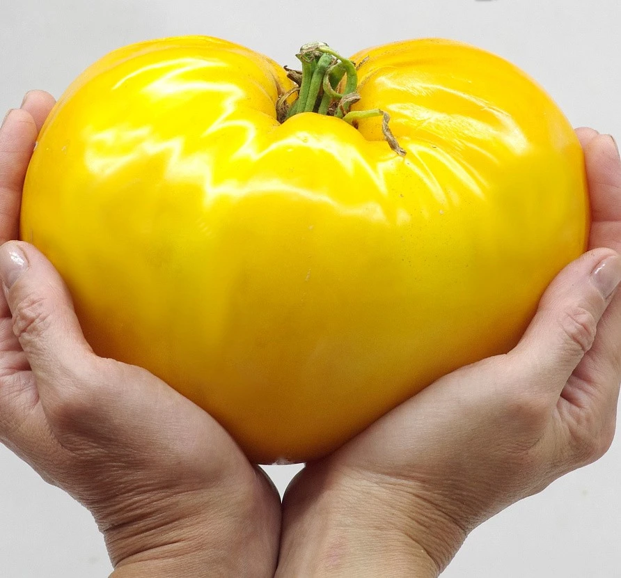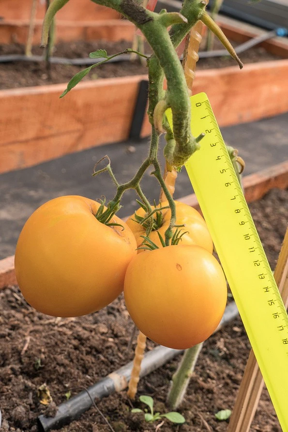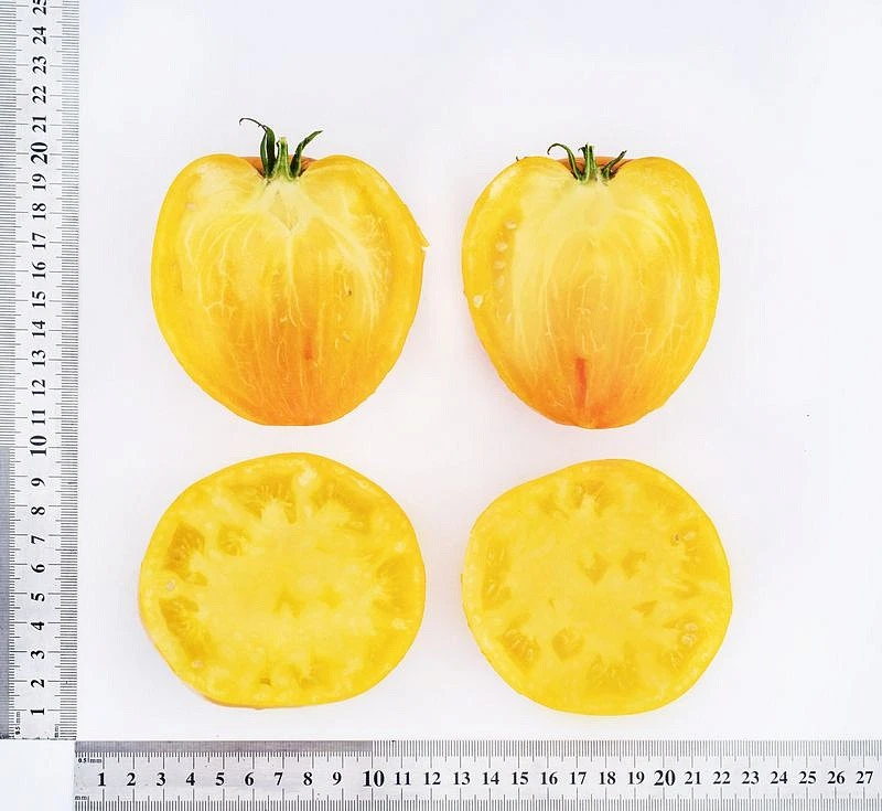 Гибрид раннеспелый, индетерминантный. От всходов до сбора первого урожая около 100 дней. Первое соцветие закладывается после 9-10 листа, последующие через 3. Кисти простые и полу сложные с 5- 7 плодами. Плоды очень крупные, мясистые, тяжелые, поэтому соплодия необходимо надежно фиксировать. Своевременный сбор созревших плодов позволяет получать максимально возможный урожай до конца октября (в средней нечерноземной зоне России), потому как растения хорошо переносят перепады допустимо низких и высоких температур. Плоды массой от 250 до 450 г. Семенные камеры многочисленные, но едва заметны в поперечном разрезе. Мякоть однородной консистенции, приятная, маслянистая, с минимальным количеством семян, цвет насыщенно жёлтый. Форма плодов коническая с тупой вершиной, с небольшой аккуратной ребристостью у плодоножки. Вкус фантастический, очень сладкий, оригинальный, с фруктовыми нотками, кожица тонкая. Томат незаменим в приготовлении салатов, закусок, оформлении блюд, а так же для приготовления необычного цвета и вкуса сока. Гибрид устойчив к вершинной, корневой гнилям и бурой пятнистости. Растение формировать в 1-2 стебля. Плотность посадки 4 растения/м2. Урожайность не менее 18 кг/м2.